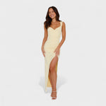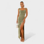 Haljina Constança redefinira sofisticiranost svojim drapiranim dekolteom i otvorenim leđima s mašnom. S uskom siluetom koja izdužuje figuru i bočnim prorezom za slobodu kretanja, idealna je za posebne događaje na kojima želite zasjati.