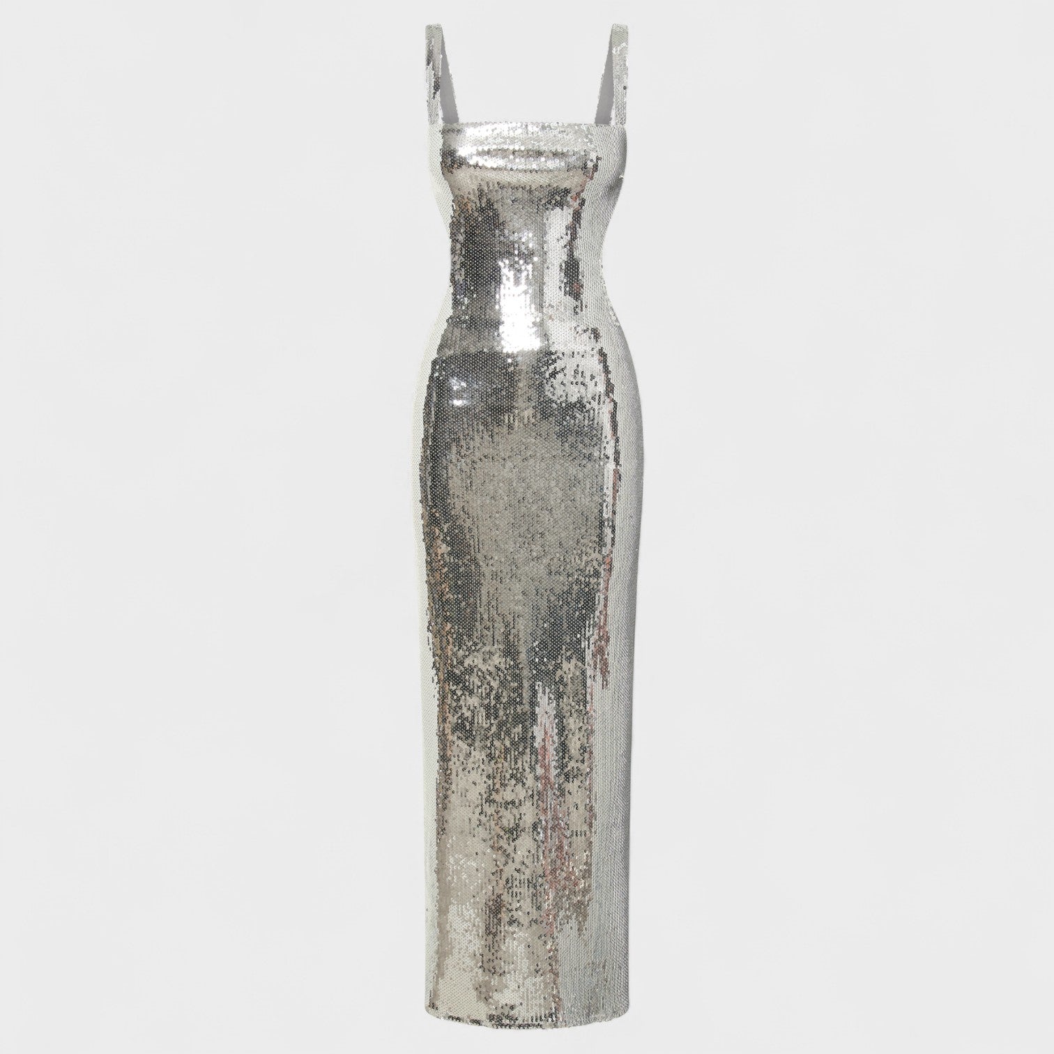 Haljina Kiara privlači pažnju od prvog trenutka. Njezina tkanina od šljaštećih šljokica odražava svjetlost s elegancijom, dok bočne proreze oblikuju siluetu sa senzualnošću. Dizajnirana za žene koje se usude sjajiti u svakom koraku.