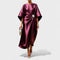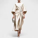 Duga večernja haljina skulpturalnog kroja s raskošnim, svilenkastim sjajem. Asimetrično drapiranje okupljeno elegantnom kopčom stvara efekt struka, dok prozračni, široki rukavi i fluidan pad tkanine osiguravaju graciozan pokret. Idealna za gala događaje, svadbene svečanosti i sve večeri kada želiš zasjati.
