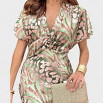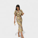 Sofisticirana midi haljina s lepršavim rukavima i drapiranim V-izrezom koji nježno naglašava dekolte. Tkanina s profinjenim sjajem i dekorativnim uzorkom elegantno pada preko tijela, dok definirani struk oblikuje ženstvenu siluetu. Završetak koji se blago širi omogućuje graciozan hod — idealno za vjenčanja, koktele i sve posebne prilike.