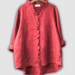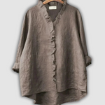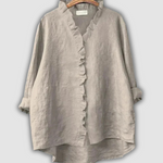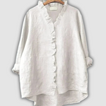 Elegantna lanena bluza koja kombinira jednostavnost i bezvremenski stil. V-izrez s suptilnom volanom dodaje ženski detalj, dok opušteni kroj pruža udobnost tijekom cijelog dana. Asimetrični rub s dužim stražnjim dijelom čini moderni, ali elegantan izbor za svaku priliku.
