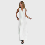Ova sofisticirana maxi haljina odiše jednostavnošću i profinjenošću. Bez rukava i s V-izrezom, pruža laskavu siluetu dok lepršavi kroj omogućuje slobodu pokreta i udobnost. Idealna je za večernje prilike, posebne događaje ili elegantne ljetne kombinacije – komad koji nikad ne izlazi iz mode.