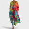 Ova haljina jedinstvena je po svom kreativnom uzorku i lepršavom kroju koji odiše umjetničkim duhom i slobodom. Duboki V-izrez i lagan materijal pružaju osjećaj elegancije i prozračnosti, dok duži kroj omogućuje udobnost i nesmetano kretanje. Savršena je za žene koje žele izgledati posebno i unijeti dašak originalnosti u svoj stil.