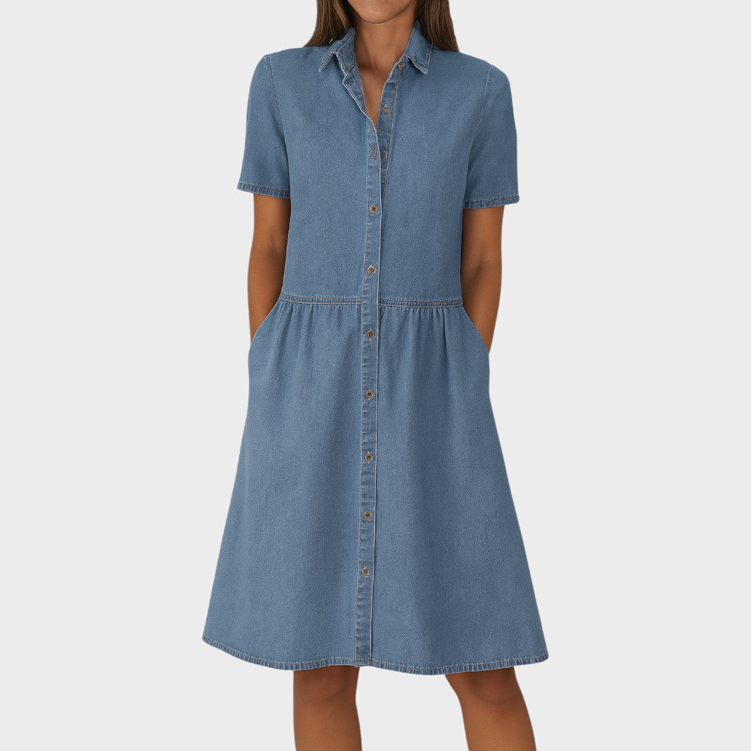 Ova košulja-haljina donosi savršen spoj praktičnosti i bezvremenskog stila. Zahvaljujući klasičnom kroju s gumbima po cijeloj dužini i ovratniku, pruža uredan i moderan izgled, dok ležerni pad materijala osigurava udobnost tijekom cijelog dana. Bočni džepovi dodaju funkcionalnost i ležernu notu, čineći je idealnom za svakodnevne kombinacije.