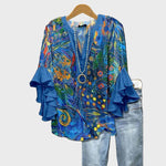 Izdvojite svoj umjetnički stil s ovom bluzom u intenzivnoj plavoj nijansi, ukrašenom šarenim apstraktnim uzorcima i detaljima koji podsjećaju na slikarsko platno. Rukavi s volanima dodaju eleganciju i pokret, dok nježna silueta čini ovu bluzu idealnom za svakodnevne i posebne prilike.