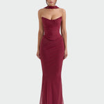 Elegantna i upečatljiva haljina bez naramenica s prilagođenim krojem koji ističe siluetu. Drapirane detalje na dekolteu i vezanje u stilu korzeta u struku dodaju ženstvenost i luksuz, dok maxi dužina pruža bezvremensku sofisticiranost. Idealna za večernje izlaske i svečane prigode.