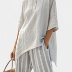Smiren stil s modernim linijama. Daisy set kombinira asimetričnu bluzu s opuštenom siluetom i prugaste hlače u neutralnim tonovima, stvarajući uravnotežen, svjež i elegantan izgled za tople klimatske uvjete.