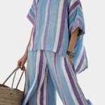Živahna svježina s kolorističkom nježnošću. Set Daisy kombinira fluidnu bluzu i hlače širokih nogavica s vertikalnim prugama inspiriranim Mediteranom. Nježne nijanse i lagana tekstura stvaraju veselu, udobnu i dinamičnu pojavu.
