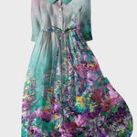 Ova jedinstvena duga haljina kombinira eleganciju s umjetničkom inspiracijom, podsjećajući na sliku koja oživljava na tkanini. Nijanse tirkizne harmonično se miješaju s ljubičastom i zelenom, stvarajući rezultat koji isijava ženstvenost i umjetničku finu. Idealna za posebne prilike, ova haljina donosi dašak romantike i kreativne elegancije.