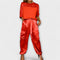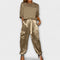 Ovaj set od dvije komade, napravljen od prozračnog i mekanog materijala, nudi elegantan i svestran izgled, prikladan za dan i noć. Bluza s kratkim rukavima dodaje dodir rafinirane elegancije, dok široke hlače osiguravaju maksimalnu udobnost i slobodu pokreta.