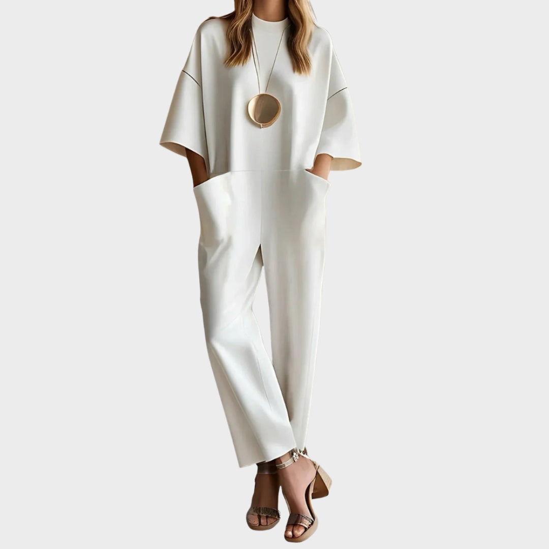 Ovaj kombinezon s kratkim rukavima nudi udobnost uz minimalistički dizajn koji se prilagođava dnevnim i večernjim prilikama. Jednostavan je za kombiniranje s različitim obućom i dodacima, pružajući moderan izgled bez napora.