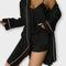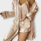 Ovaj set pidžame od satena savršena je kombinacija senzualnosti i udobnosti. Sastoji se od topa s tankim naramenicama, kratkih hlača i kućnog ogrtača s kontrastnim završetkom, pruža satenski dodir koji se glatko klizi po koži. Idealno za posebne noći ili za one koji vole osjećati se elegantno čak i dok se opuštaju.