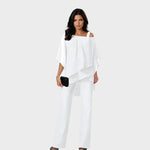 Ovaj sofisticirani komplet kombinira udobnost i profinjen stil u jedinstvenoj odjevnoj kombinaciji. Lepršava bluza s asimetričnim slojevima daje ženstvenu notu, dok ravne hlače pružaju eleganciju i slobodu kretanja. Savršen izbor za večernje izlazke, proslave ili poslovne događaje gdje želite ostaviti snažan dojam.