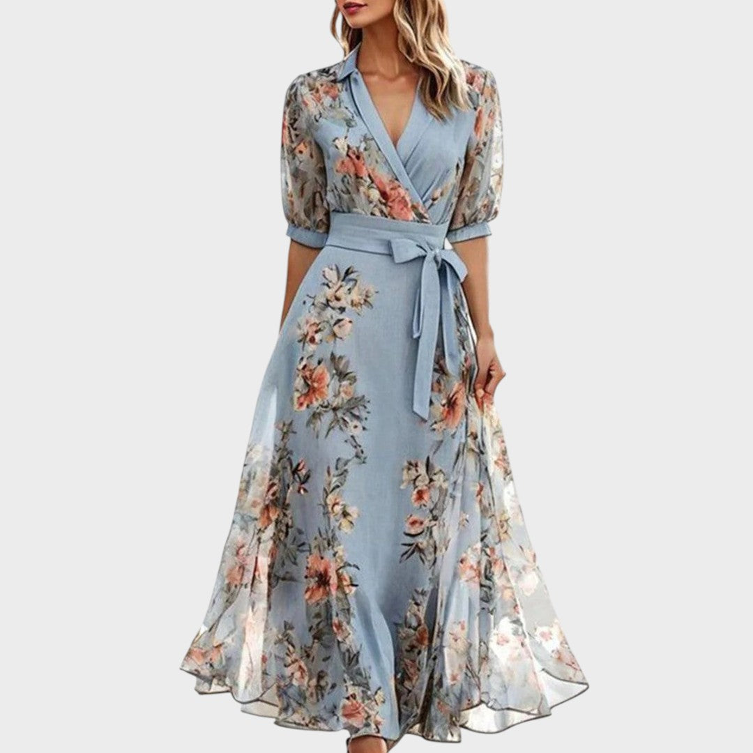 Ova midi haljina odiše gracioznošću i romantikom zahvaljujući profinjenom kroju i laganom materijalu koji osigurava udobnost tijekom cijelog dana. Cvjetni uzorak unosi svježinu i posebnu notu ženstvenosti, dok praktični džepovi čine je savršenim spojem elegancije i funkcionalnosti. Idealna je za šetnje, druženja ili posebne prilike gdje želite zablistati s lakoćom.