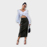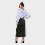 Suknja koja kombinira eleganciju i praktičnost, pružajući savršen završni dodir svakoj kombinaciji. Njen svestrani dizajn čini je idealnom za sve prilike, od ležernih do elegantnijih. S minimalnom estetikom i udobnom krojem, predstavlja osnovni komad za svaku garderobu.