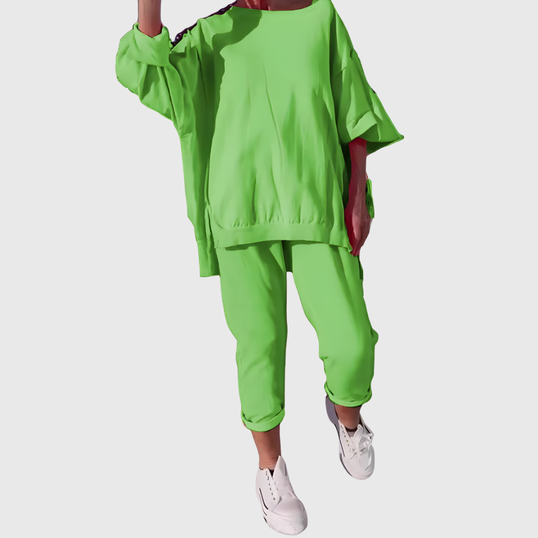 Ovaj komplet donosi savršen spoj opuštenog dizajna i praktične udobnosti. Gornji dio širokog kroja i hlače ravnih linija omogućuju slobodu pokreta, dok moderan izgled čini da budete spremni i za kućni odmor i za ležerne gradske izlaske. Savršeno rješenje za one koji žele izgledati moderno, a osjećati se potpuno opušteno.