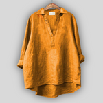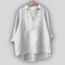 Elegantna lanena bluza u bijeloj boji koja isijava svježinu i bezvremenski stil. Ima V-izrez s diskretnim kopčanjem, duge rukave koji se mogu podići i asimetričan završetak s dužim stražnjim dijelom, pružajući udobnost i lakoću pokreta. Idealni izbor za cool ljetne kombinacije ili elegantan casual izgled.