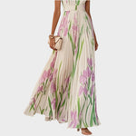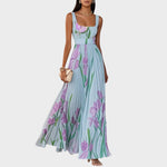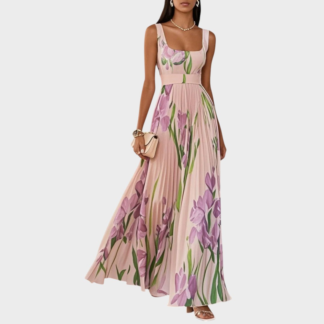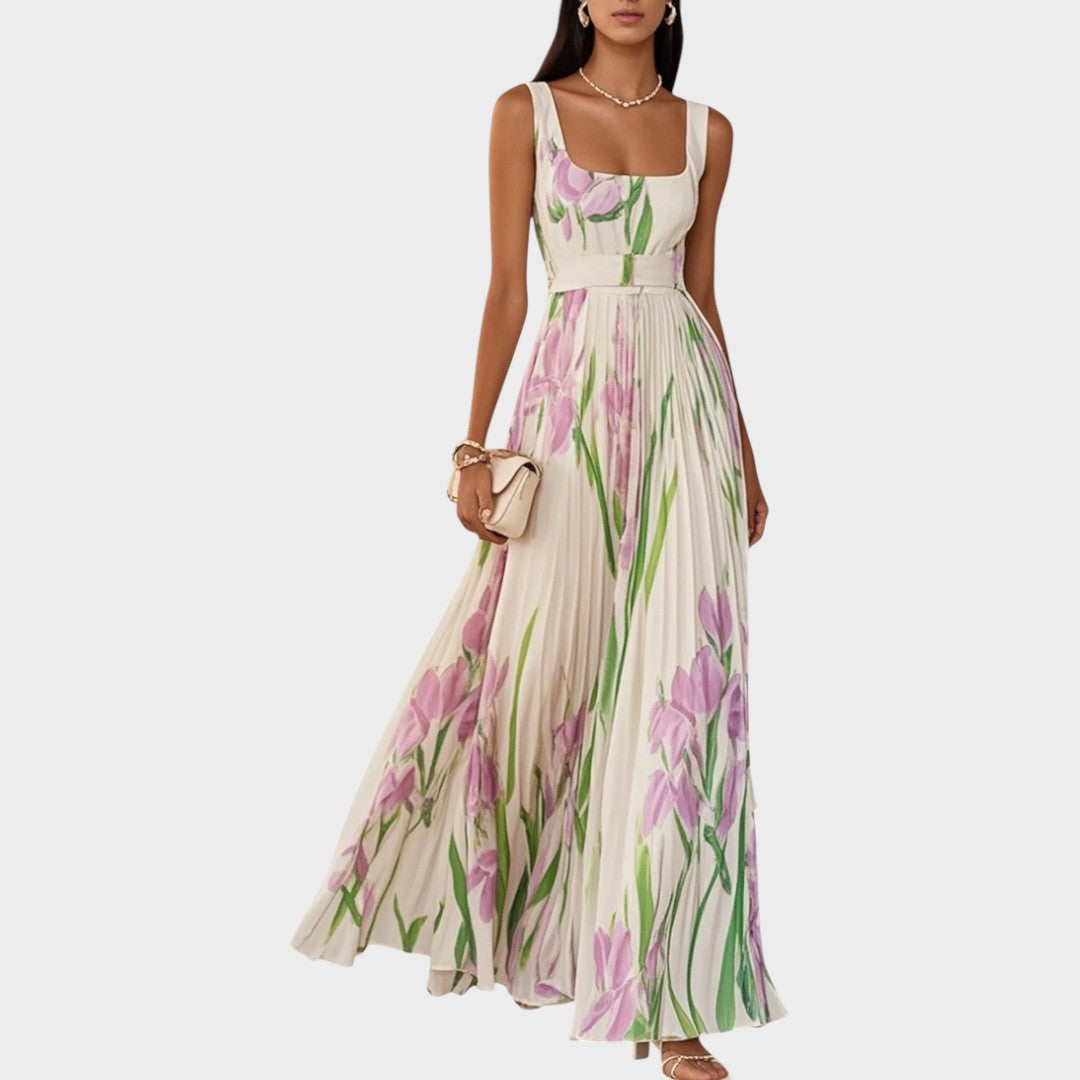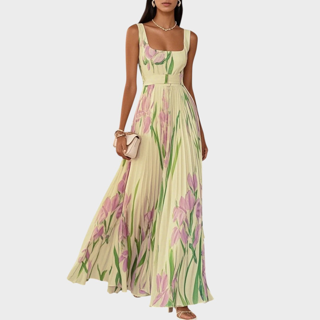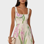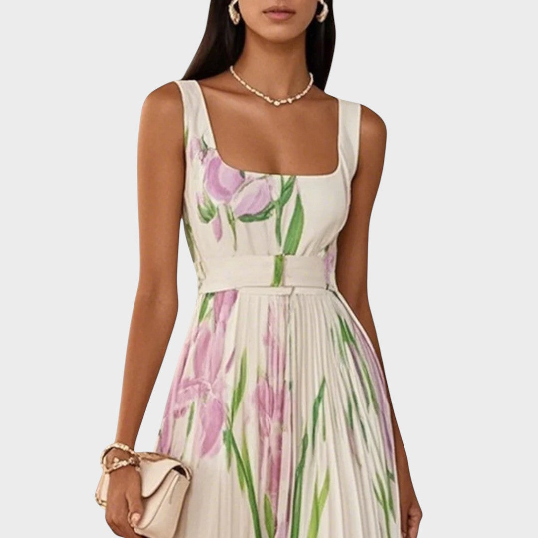 Danica duga plisirana haljina s cvjetnim uzorkom i kvadratnim izrezom