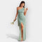 Elegantna i moderna, ova haljina kombinira asimetrični kroj s fluidnim materijalom za sofisticiran i ženstven izgled. Idealna za posebne prigode i blistave večeri.