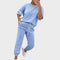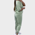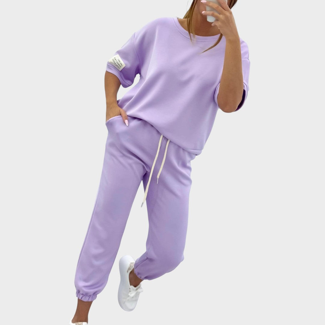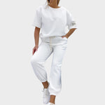 Minimalistički, 2-dijelni komplet za svaki dan. Opuštena majica s kratkim rukavima i spuštenim ramenima uparena je s jogger hlačama s elastičnim strukom na vezicu, bočnim džepovima i manšetama na gležnjevima. Glatka, mekana tkanina s blagim rastezanjem pruža udobnost kod kuće, na putu ili u gradu.
