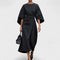 Rafinirana duga haljina s lađa izrezom i voluminoznim rukavima gradi profinjenu, arhitektonsku siluetu. Široki pojas ističe struk, dok raskošno padajuća suknja omogućuje slobodu kretanja i graciozan hod. Minimalistički detalji i čiste linije čine je savršenim izborom za svečane prigode, poslovne evente i večernje izlazke.